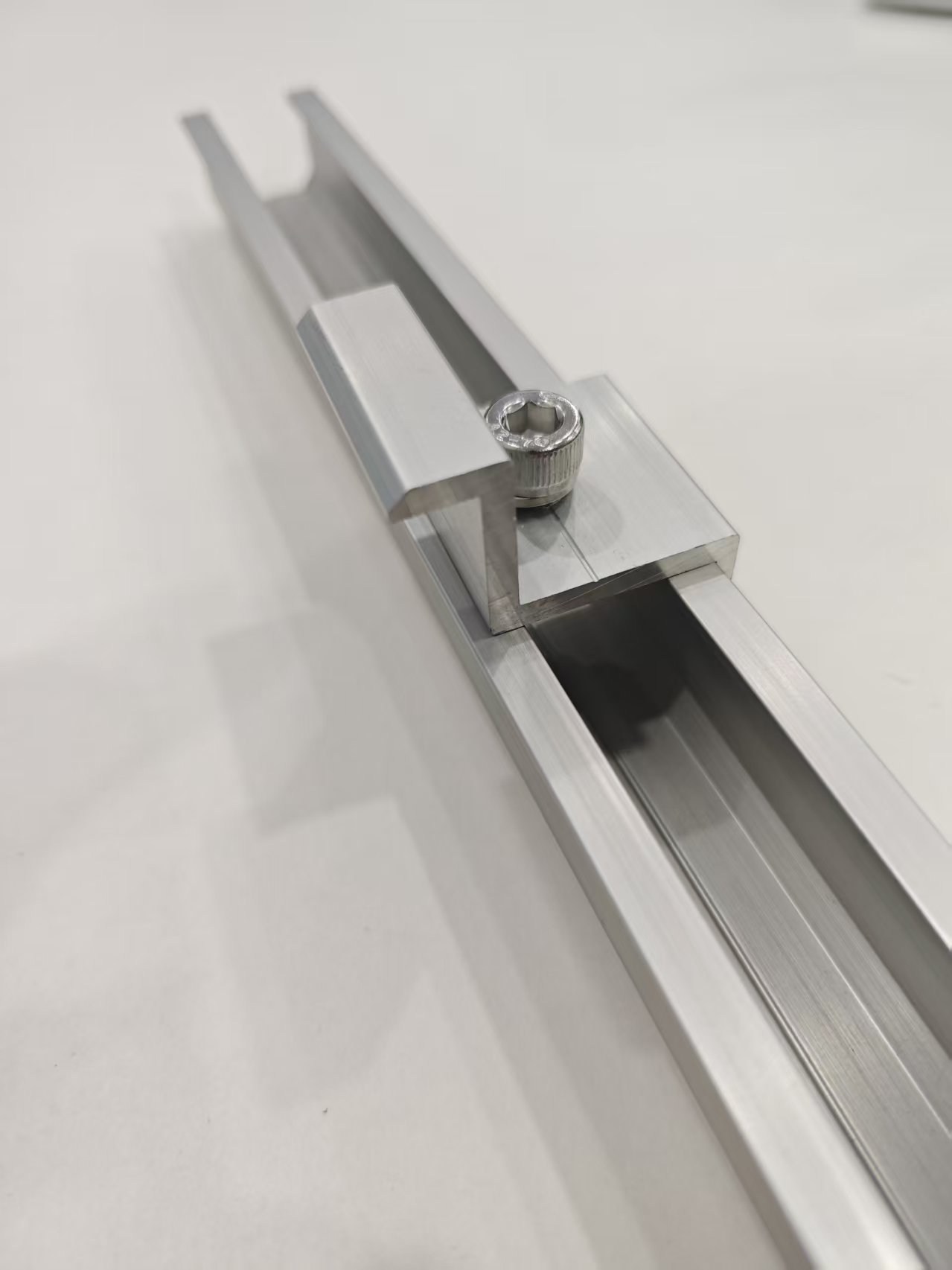 Дължината на алуминиевите соларни мини релси е значително по-къса от стандартните релси, оттук и името мини релса. Проектиран специално за покривни фотоволтаични монтажни системи, той е изключително лек, което значително намалява натиска върху покривната конструкция. Неговият уникален U-образен дизайн позволява фотоволтаичните панели да бъдат закрепени към релсата само с крайна или средна скоба, което прави монтажа изключително прост и значително съкращава сроковете на проекта.